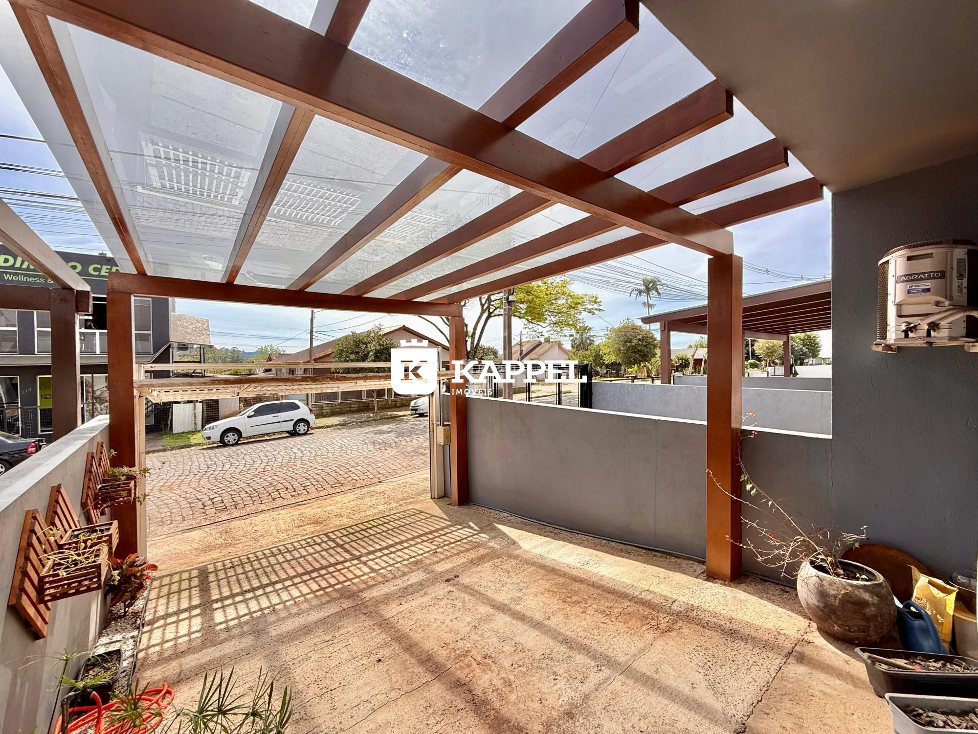 Pergolado com vidro na frente, que valoriza a fachada e dá um toque moderno
